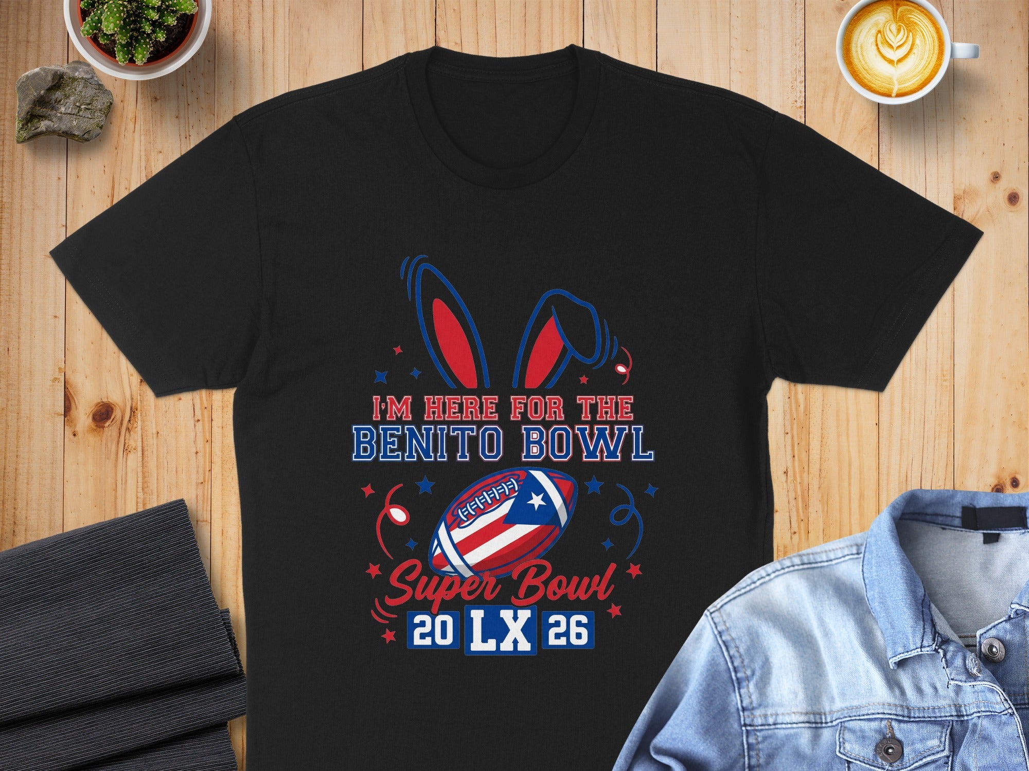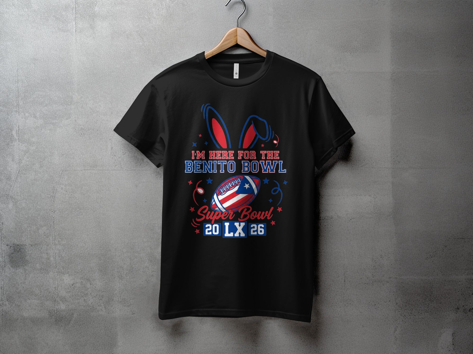 Show your spirit with this unique Benito Bowl T-Shirt, perfect for the ultimate football fan and a fun twist on Super Bowl LX 2026 celebrations. This design combines the excitement of the game with a touch of Easter whimsy, featuring bunny ears and festive elements. Grab yours now and stand out in the crowd!