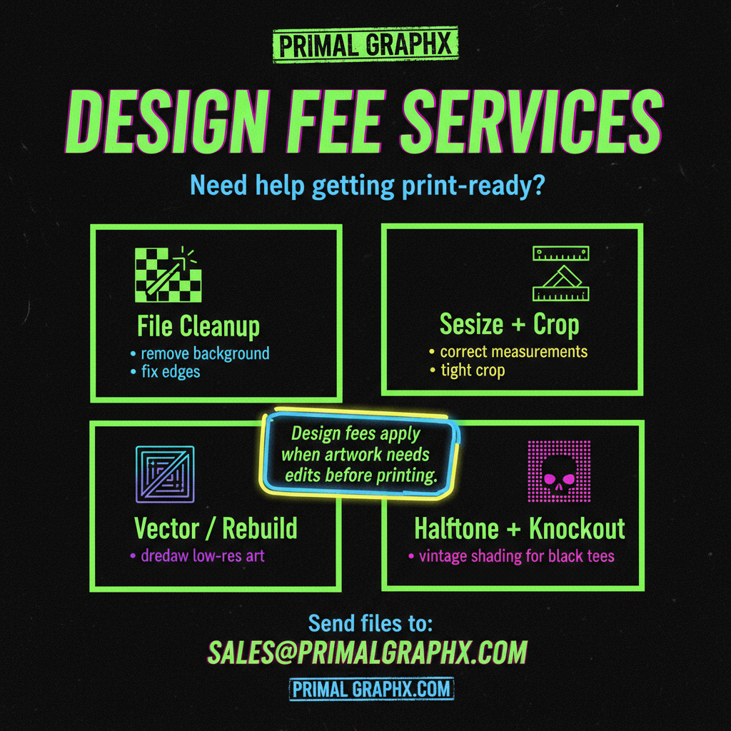 Please email images and instructions to sales@primalgraphx.com